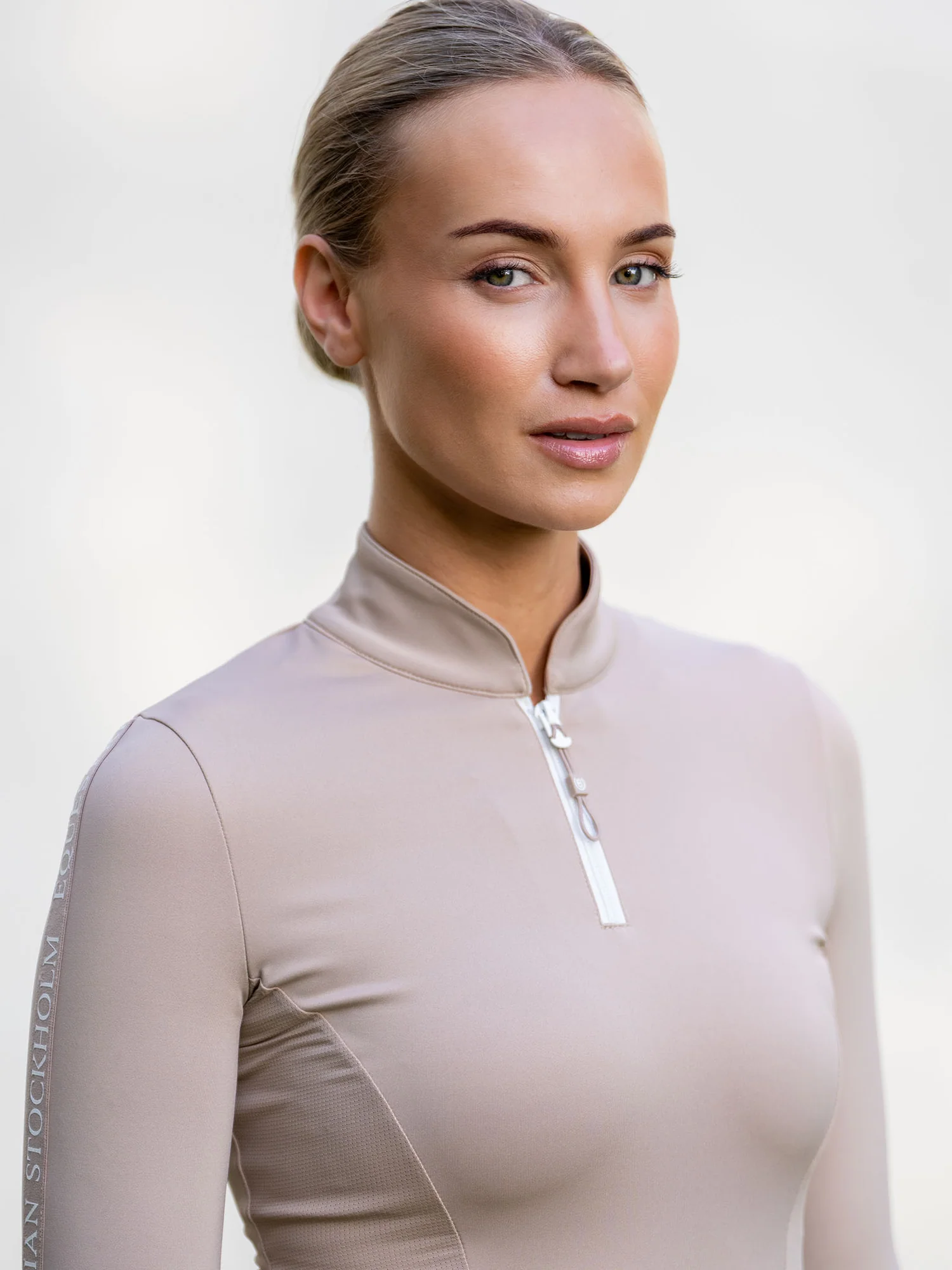 Bluza W sportowym stylu w kolorze beżowym, dzięki której będziesz nie do zatrzymania. Na obu rękawach znajduje się napis Equestrian Stockholm. Białe detale są także przy suwaku.