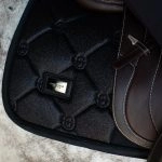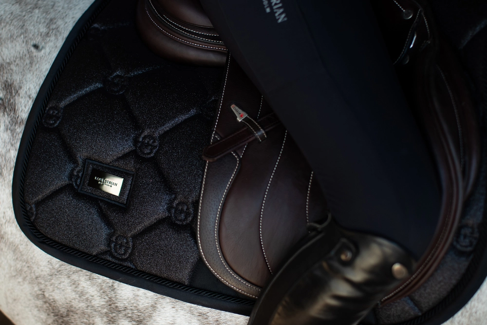 Piękny czaprak w czarnym kolorze. Połysku dodaje mu materiał z dodatkiem brokatu. Ozdobiony stylową, plakietką Equestrian Stockholm. Wykonany z błyszczącego, odpornego na zabrudzenia materiału, który dobrze oddycha i sprawia, że Twój koń nie spoci się aż tak bardzo podczas treningu. Czaprak ma pikowanie z logo Equestrian Stockholm.