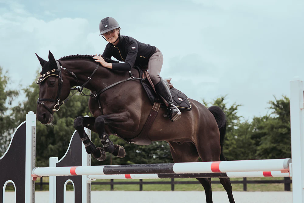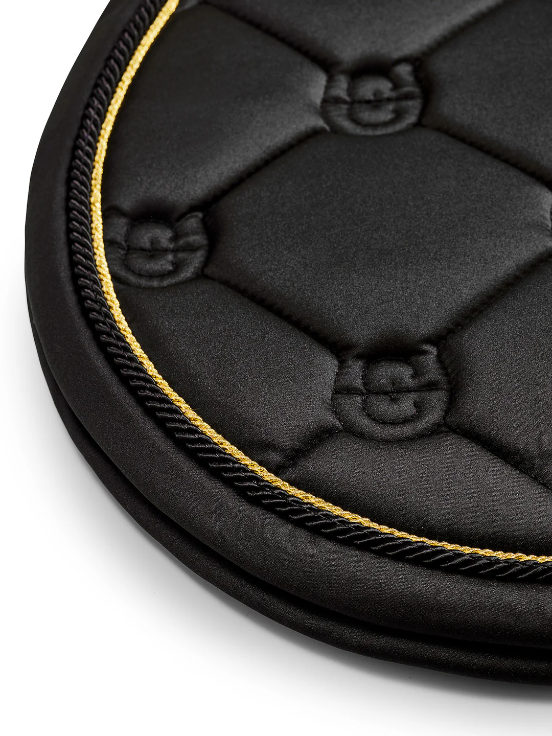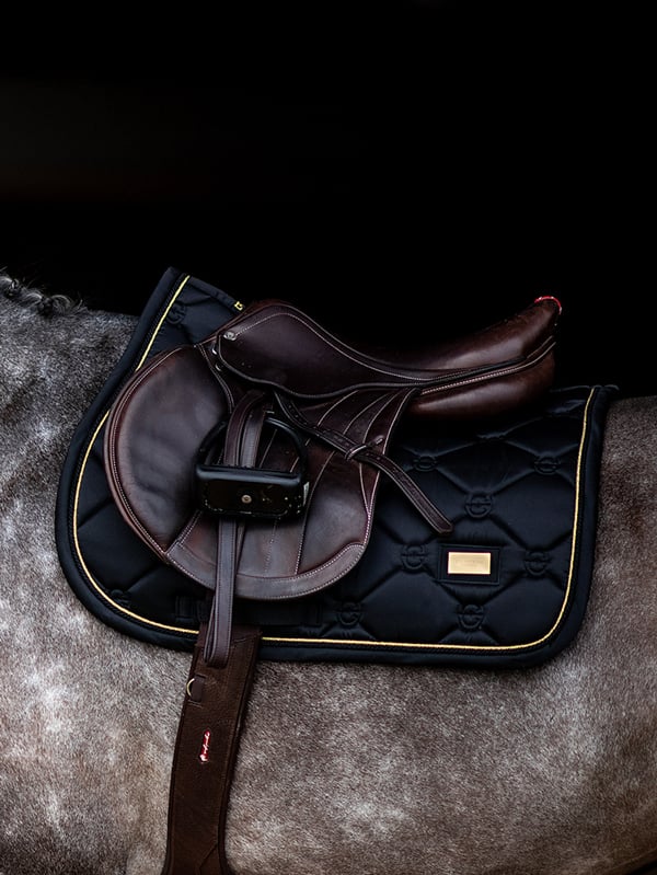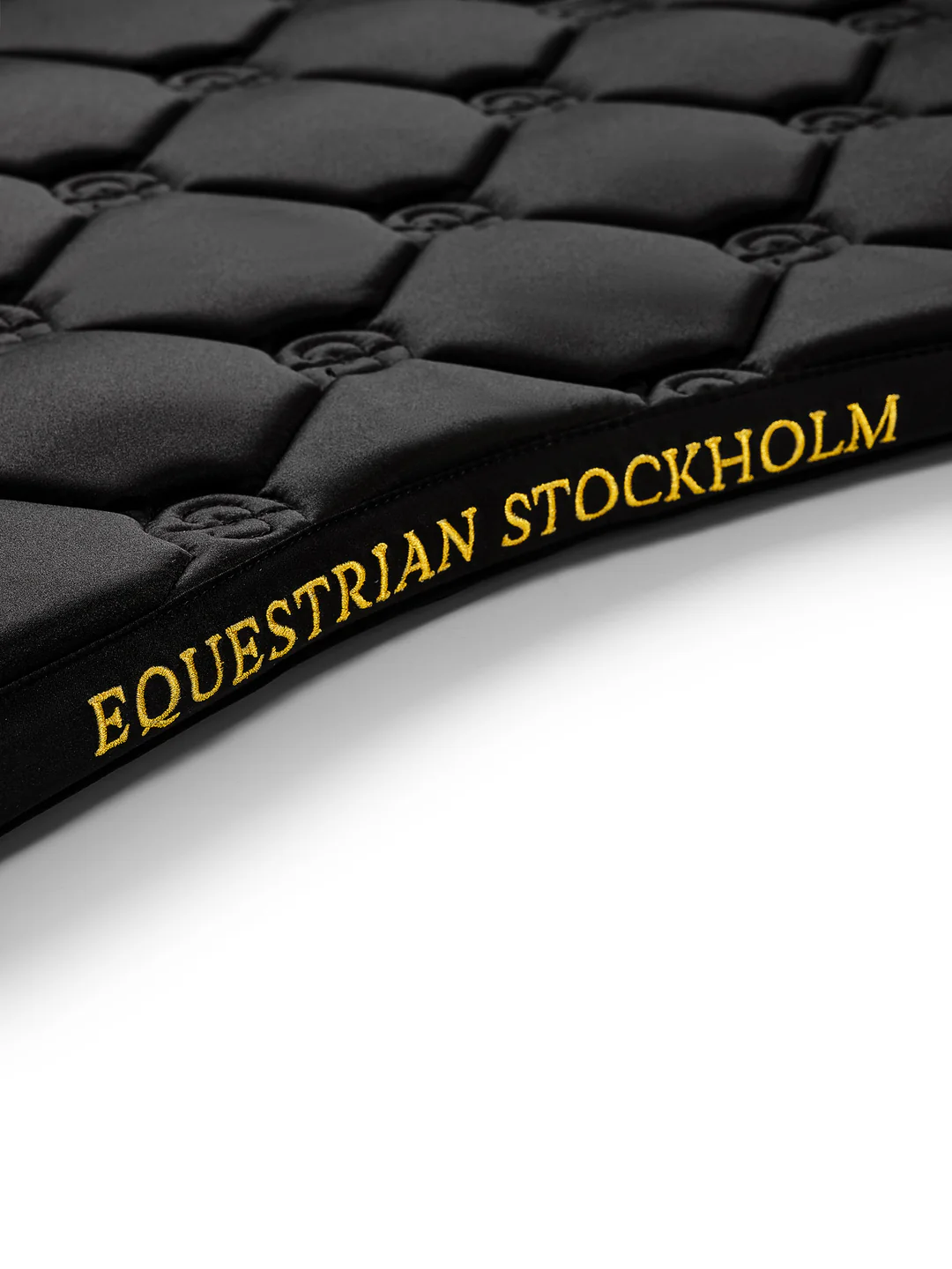 Czaprak skokowy w kolorze czarnym z detalami w kolorze złotym. Ozdobiony stylową plakietką Equestrian Stockholm. Wykonany z błyszczącego, odpornego na zabrudzenia materiału, który dobrze oddycha i sprawia, że Twój koń nie spoci się aż tak bardzo podczas treningu. Czaprak ma pikowanie z logo Equestrian Stockholm.