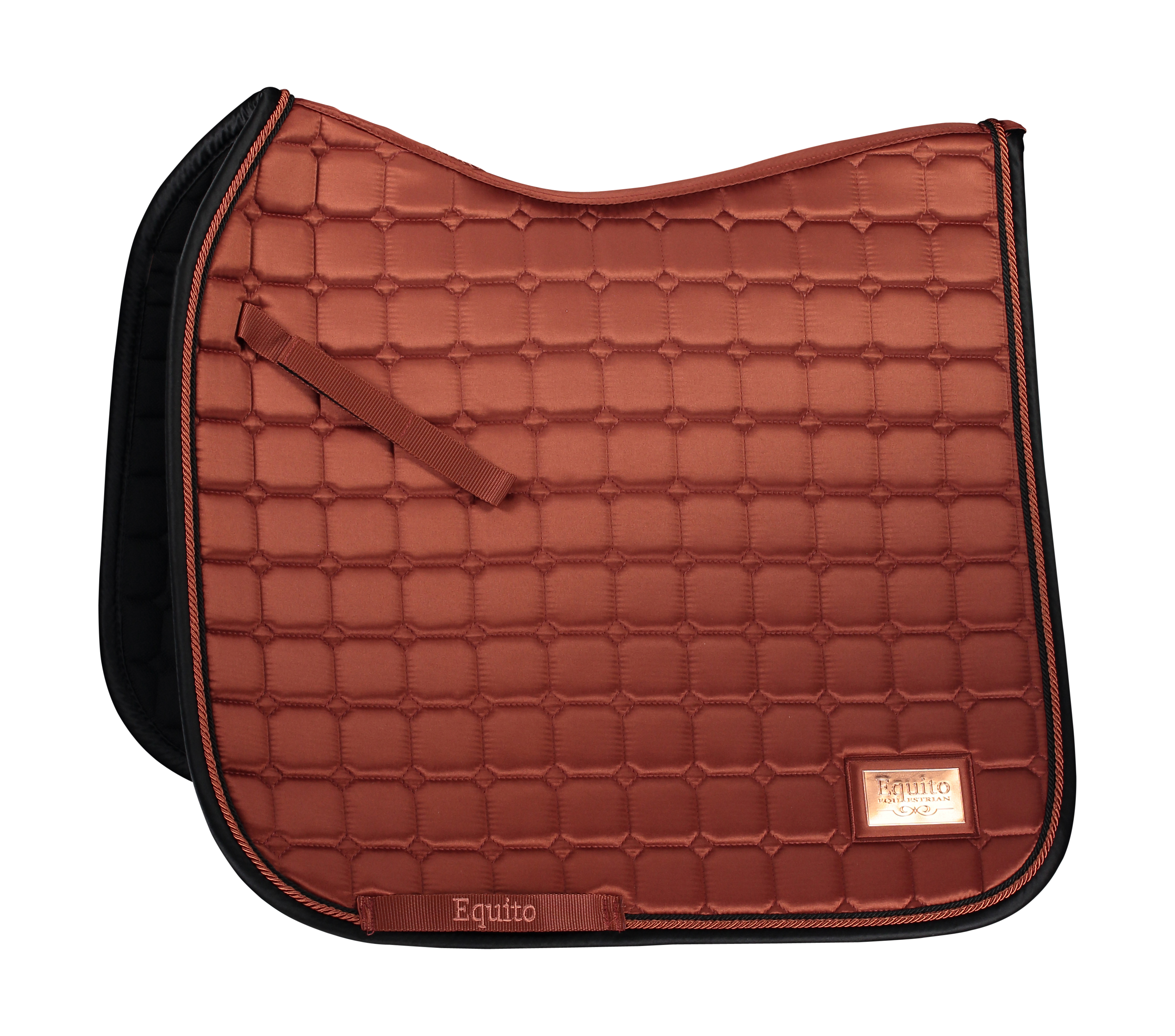 Elegancji dodają mu: piękne ośmiokątne pikowanie, czarna lamówka, błyszczące sznurki oraz elegancka naszywka z logo Equito w kolorze brązowym.
