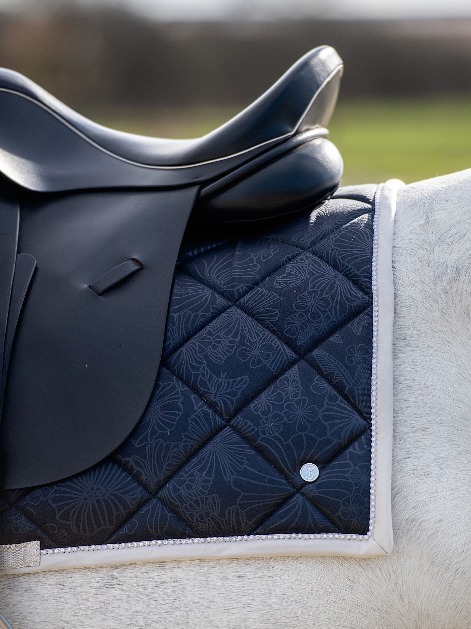 Anatomicznie ukształtowany czaprak z pięknymi kryształkami przy lamówce. Na materiale wierzchnim jest piękny kwiatowy print.