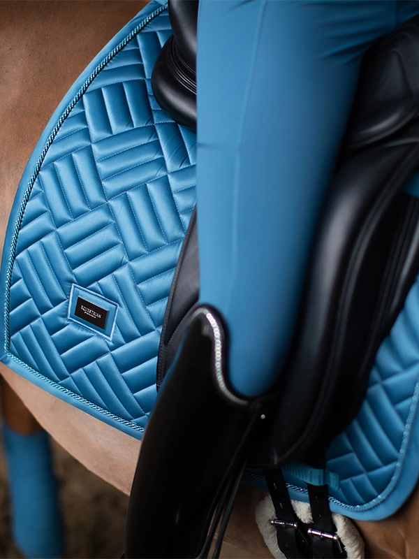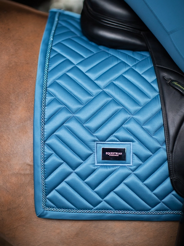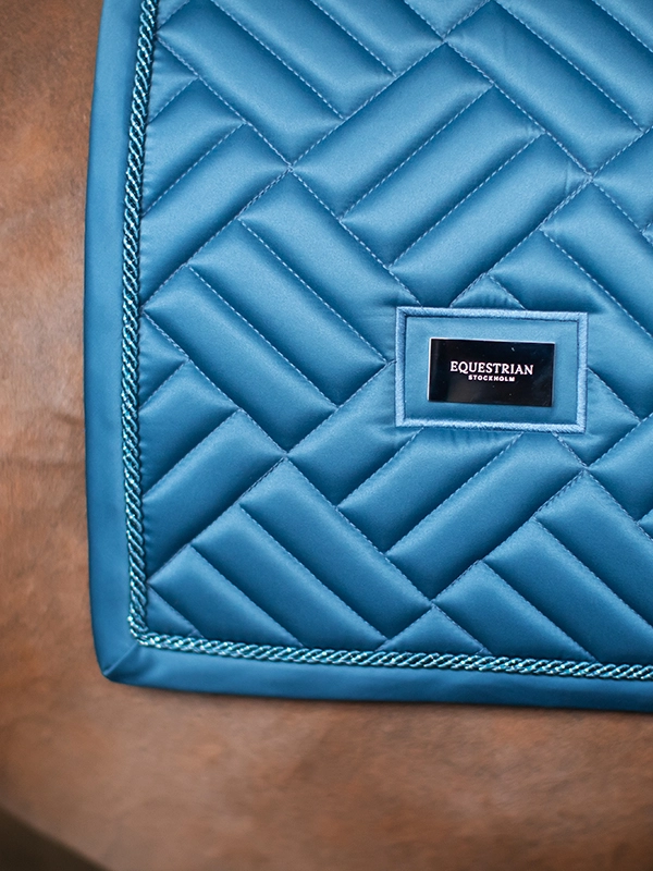 Piękny czaprak w kolorze błękitnym. Ozdobiony stylową plakietką Equestrian Stockholm. Wykonany z błyszczącego, odpornego na zabrudzenia materiału, który dobrze oddycha i sprawia, że Twój koń nie spoci się aż tak bardzo podczas treningu.