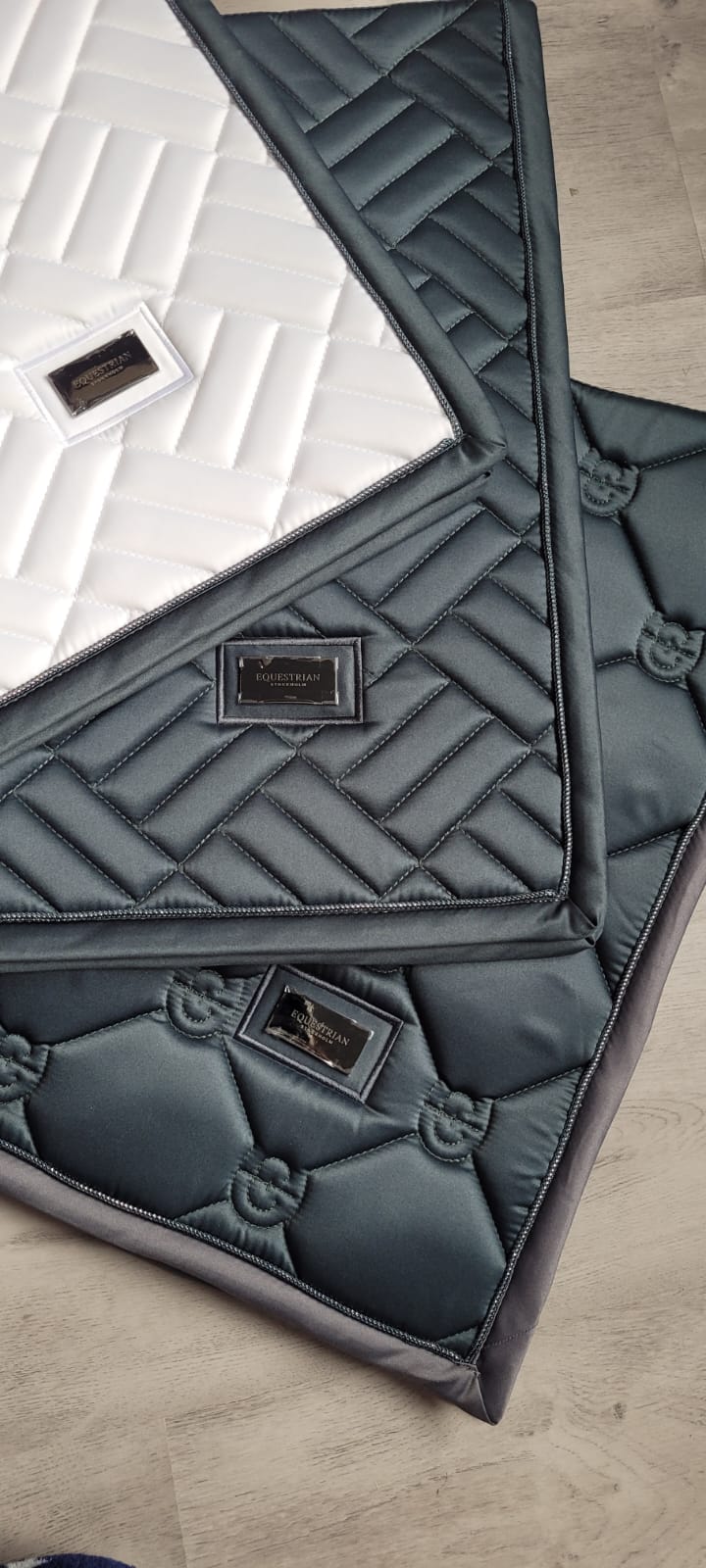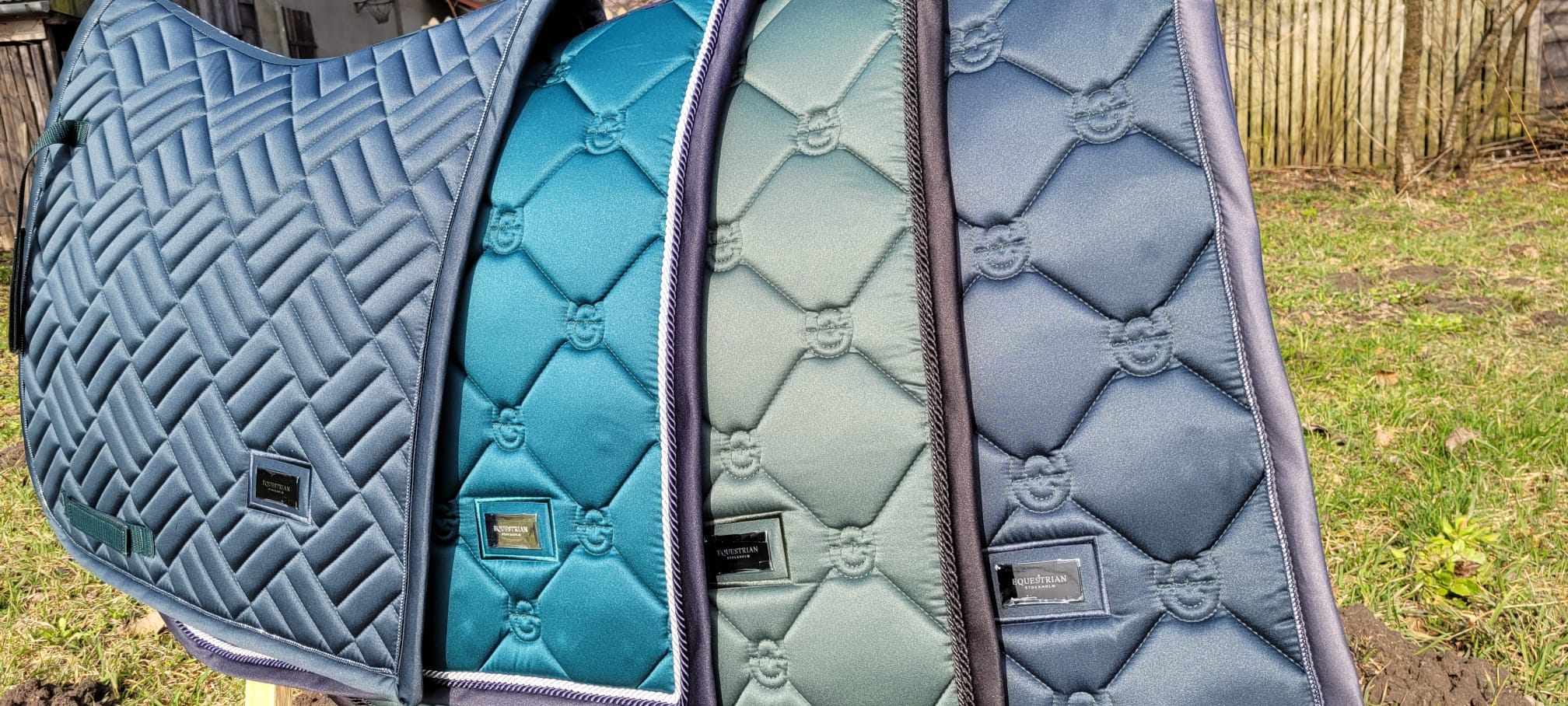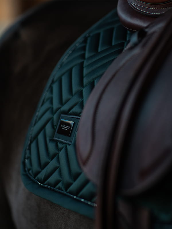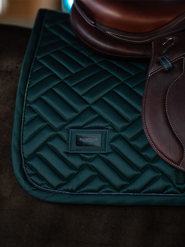 Czaprak skokowy Modern Dramatic Monday wyróżnia się pięknym ciemnozielonym kolorem oraz nowoczesnym pikowaniem. Lamówka jest w tym samym kolorze co czaprak, a ozdobny sznurek w kolorze ciemnozielonym i srebrnym. Czaprak po obu stronach ma plakietkę Equestrian Stockholm w kolorze czarnym. Wykonany jest z błyszczącego, odpornego na zabrudzenia materiału, który dobrze oddycha i sprawia, że Twój koń nie spoci się aż tak bardzo podczas treningu.