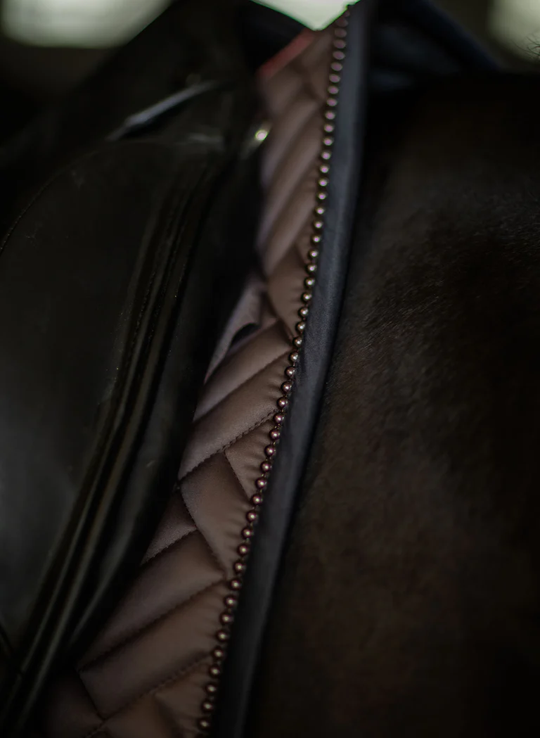 Czaprak Modern Mocha wyróżnia się nie tylko wzorem pikowania, ale też pięknym brązowym kolorem oraz perełkami, którymi jest obszyty. Lamówka oraz ozdobny sznurek są w tym samym kolorze. Czaprak po obu stronach ma plakietkę Equestrian Stockholm w kolorze czarnym. Wykonany jest z błyszczącego, odpornego na zabrudzenia materiału, który dobrze oddycha i sprawia, że Twój koń nie spoci się aż tak bardzo podczas treningu.