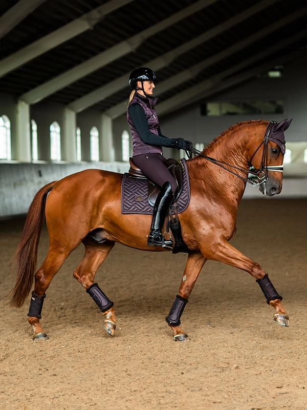 Czaprak skokowy Modern Moonless Night wyróżnia się nie tylko nowym wzorem pikowania, ale też pięknym kolorem, który jest połączeniem brązu z fioletem. Lamówka oraz ozdobny sznurek są w tym samym kolorze. Czaprak po obu stronach ma plakietkę Equestrian Stockholm w kolorze rose gold. Wykonany jest z błyszczącego, odpornego na zabrudzenia materiału, który dobrze oddycha i sprawia, że Twój koń nie spoci się aż tak bardzo podczas treningu.