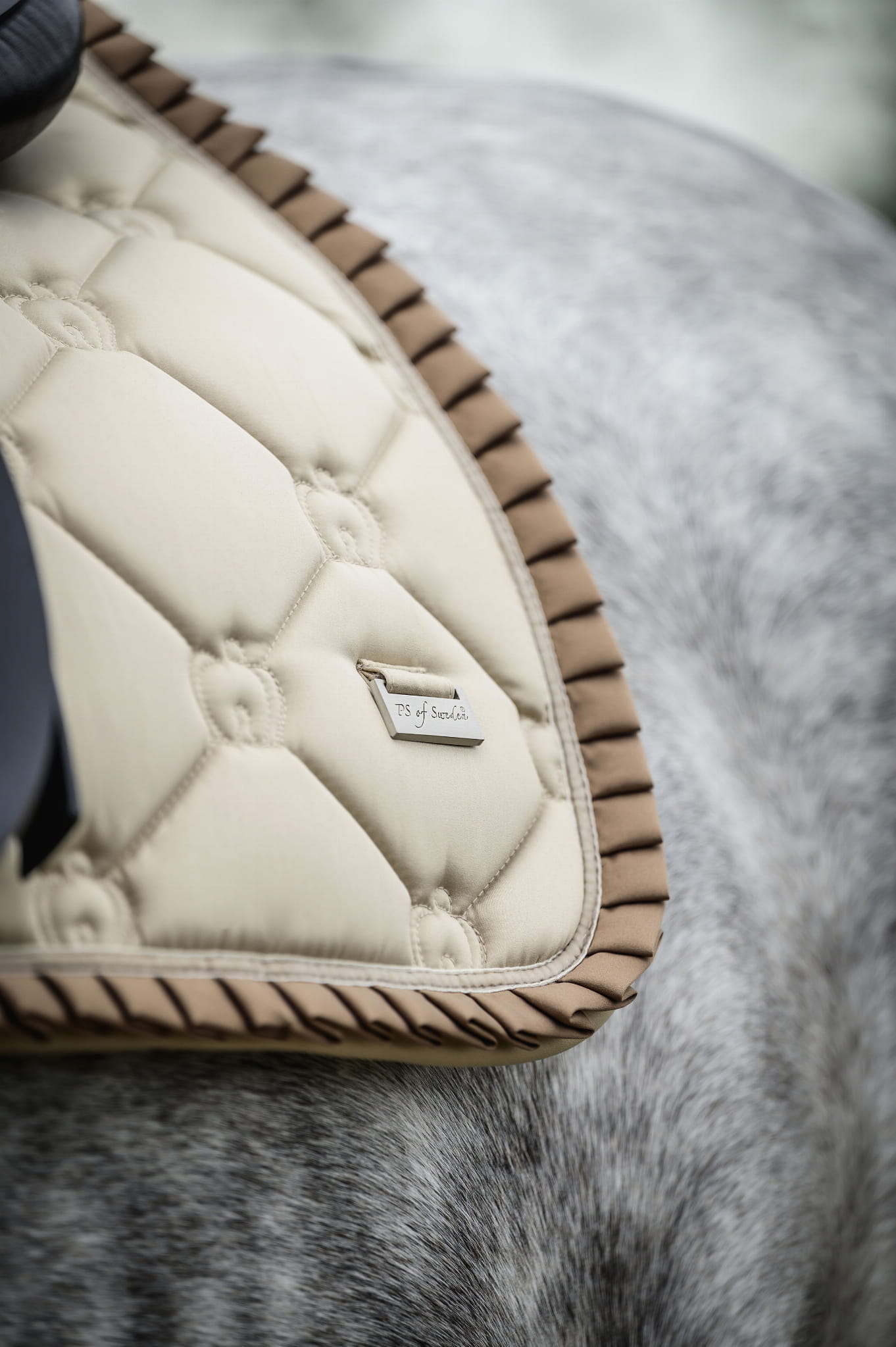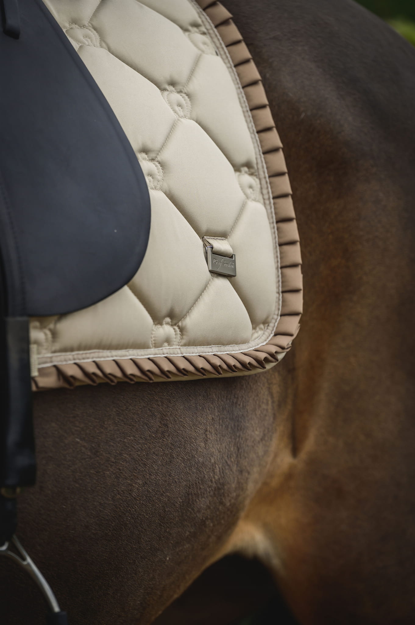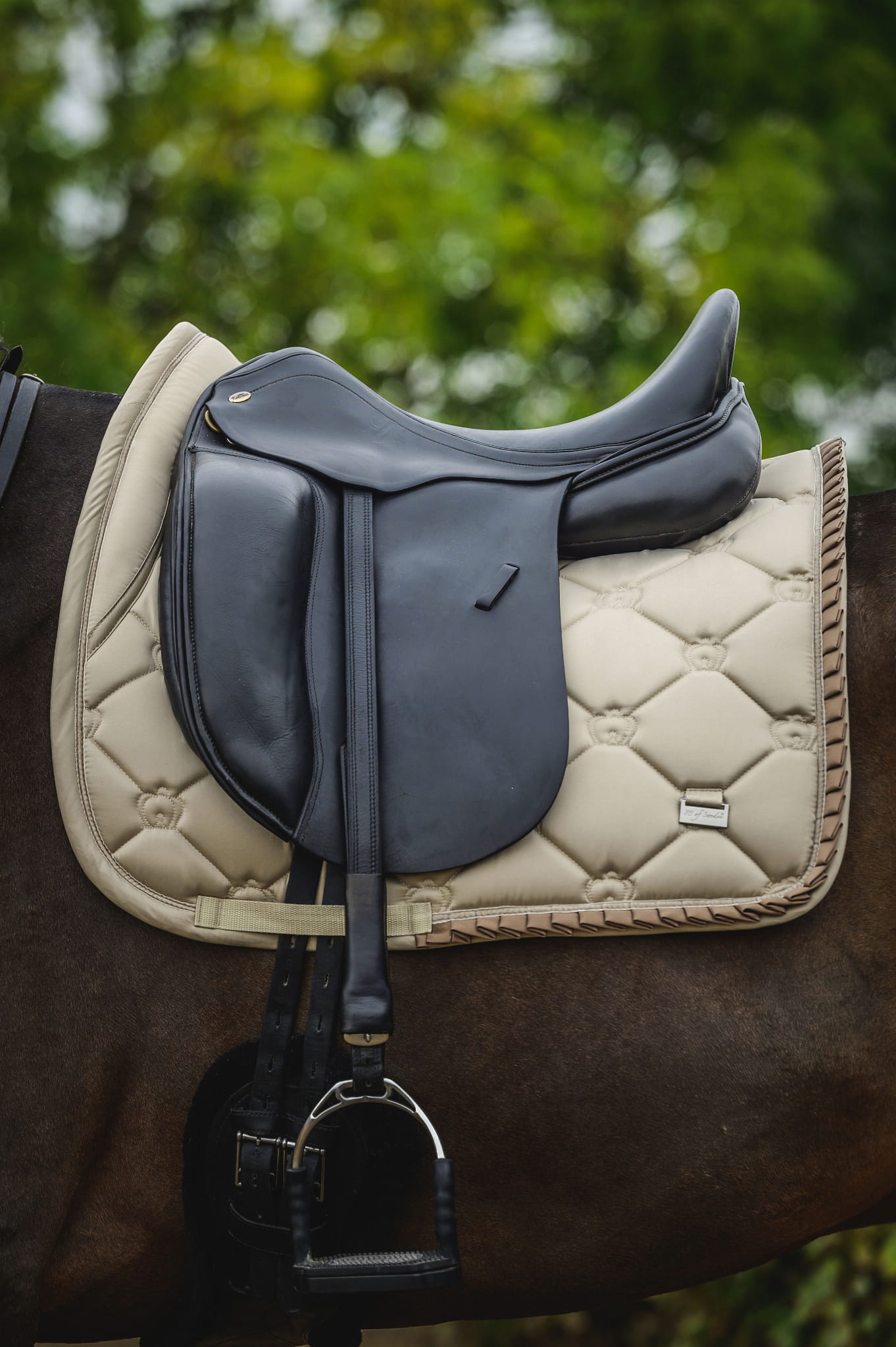 Zupełnie nowy model czapraka, emanujący elegancją i klasą, wykonaniem na najwyższym poziomie, z pikowaniem z monogramem PS of Sweden. Anatomicznie ukształtowany czaprak ma elegancką aksamitną lamówkę oraz satynową falbankę. Wyjątkowy cytat wyhaftowany na czapraku i dyskretna srebrna naszywka PS to kolejne elementy nadające mu elegancji.