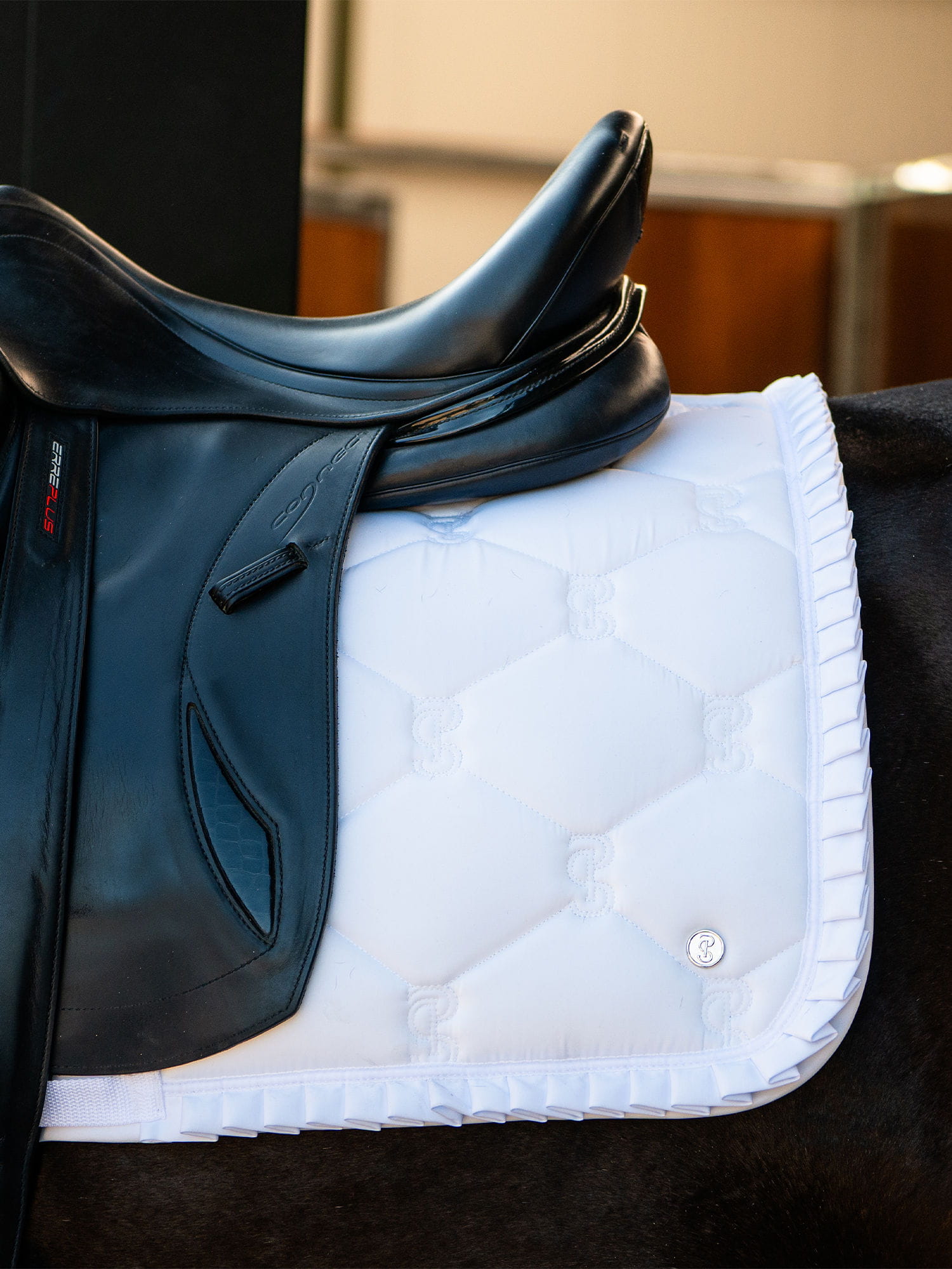 To czaprak emanujący elegancją i klasą, wykonaniem na najwyższym poziomie, ma pikowanie z nowym monogramem PS of Sweden. Anatomicznie ukształtowany czaprak ma elegancką aksamitną lamówkę oraz satynową falbankę. Wyjątkowy cytat wyhaftowany na czapraku i dyskretna srebrna naszywka PS to kolejne elementy nadające mu elegancji.