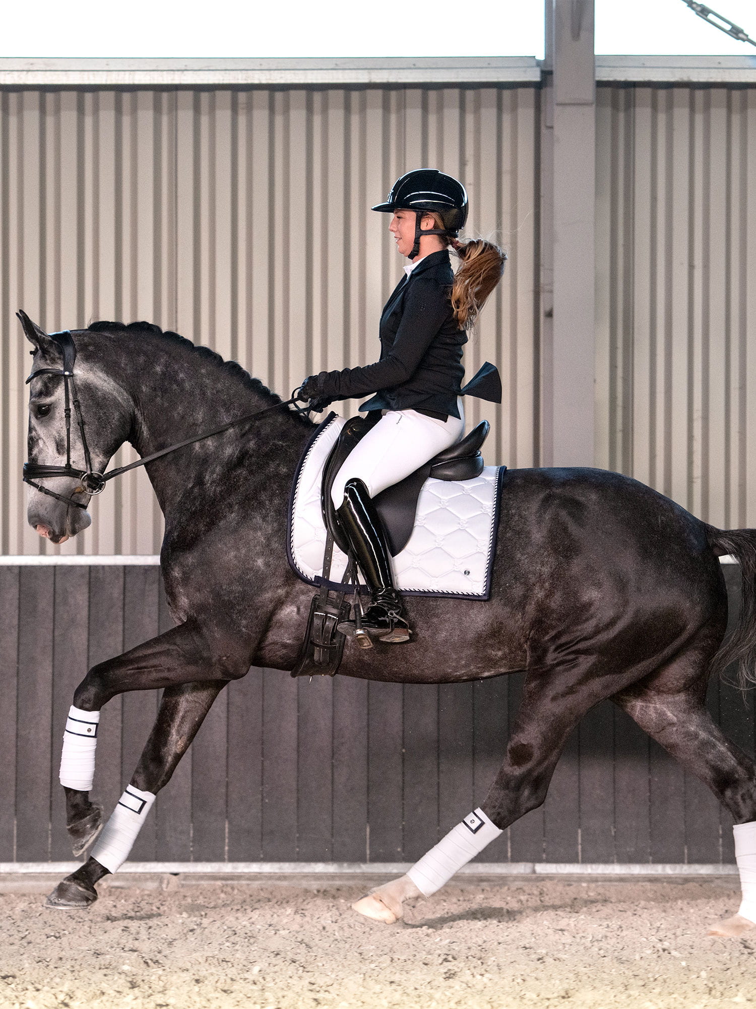 Anatomiczny kształt czapraków PS of Sweden powoduje, że taki nacisk nie występuje w ogóle. Podczas jazdy ważne jest by czaprak nie przesuwał się pod siodłem, ponieważ może to doprowadzić do otarć. Dzięki unikalnym poduszkom z przodu i pasami na popręg czapraki PSoS zawsze pozostają w jednym miejscu przez całą jazdę.