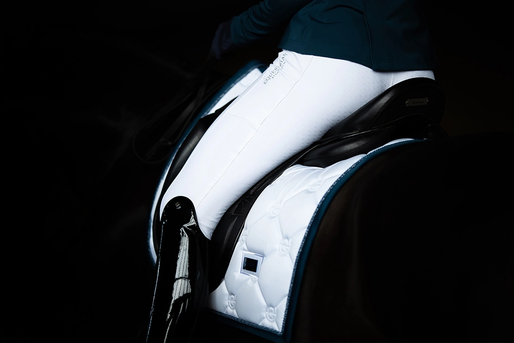 Piękny czaprak skokowy w białym kolorze z granatowymi detalami. Czaprak ozdobiony stylową plakietką Equestrian Stockholm. Wykonany z błyszczącego, odpornego na zabrudzenia materiału, który dobrze oddycha i sprawia, że Twój koń nie spoci się aż tak bardzo podczas treningu. Czaprak ma pikowanie z logo Equestrian Stockholm.