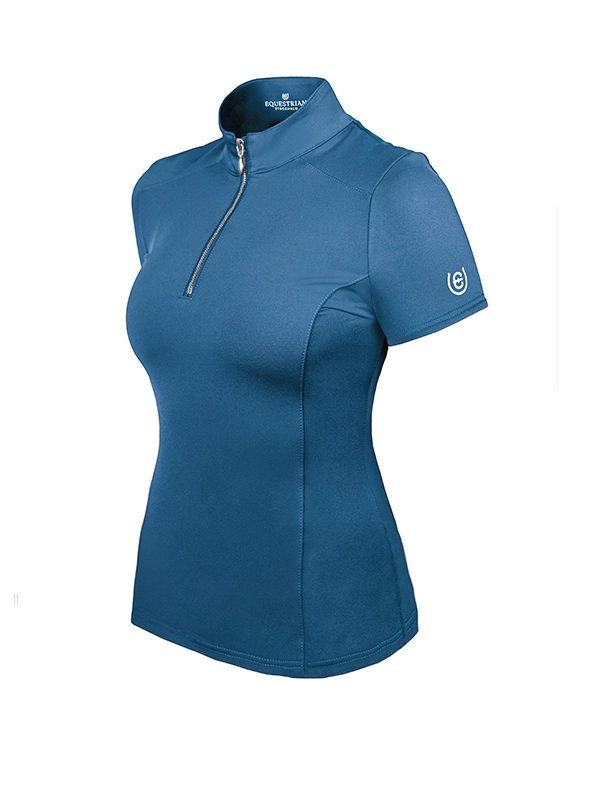Koszulka wykonana jest z oddychającej mieszanki poliestru z recyklingu, ma dopasowany krój i jest elastyczna. Ozdobiona pionowym logo ES w kolorze złota na plecach i mniejszym logo na lewym ramieniu. Zapinana pod szyją na zamek.