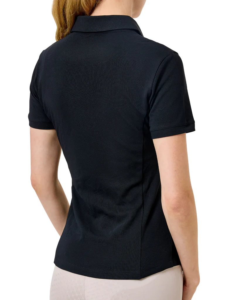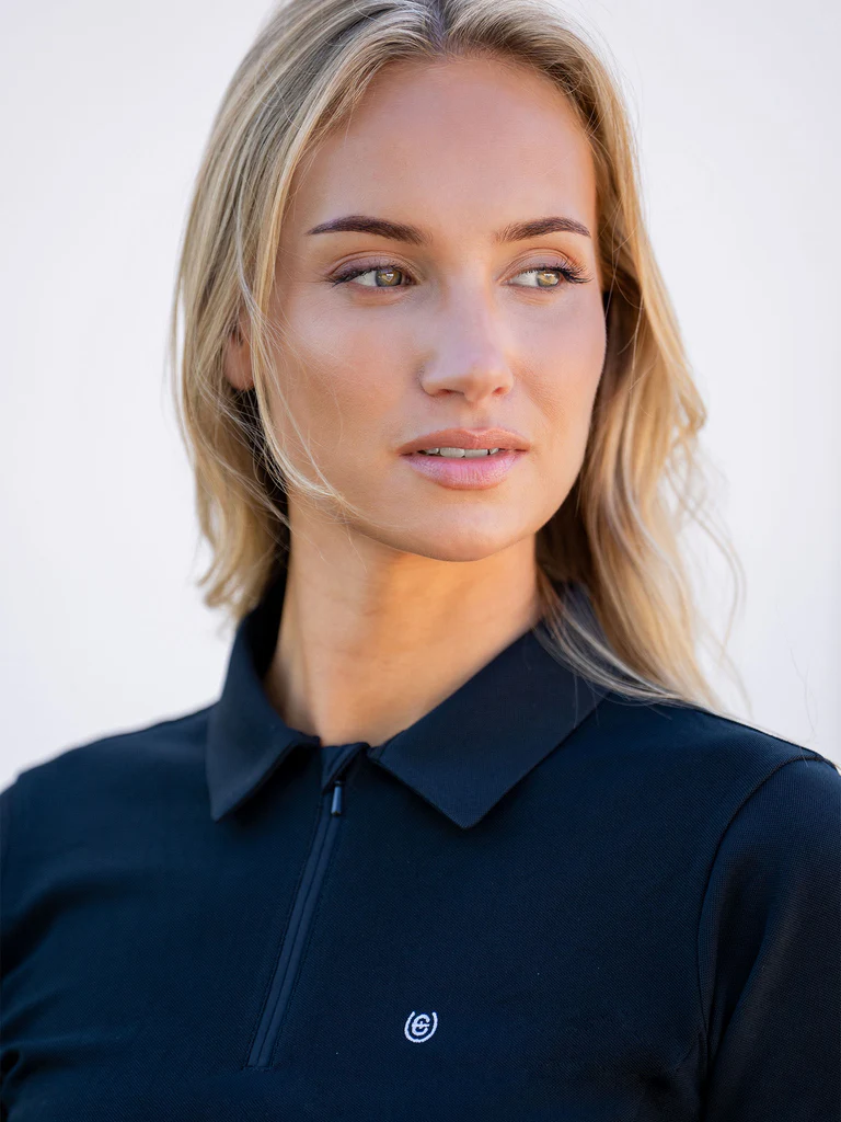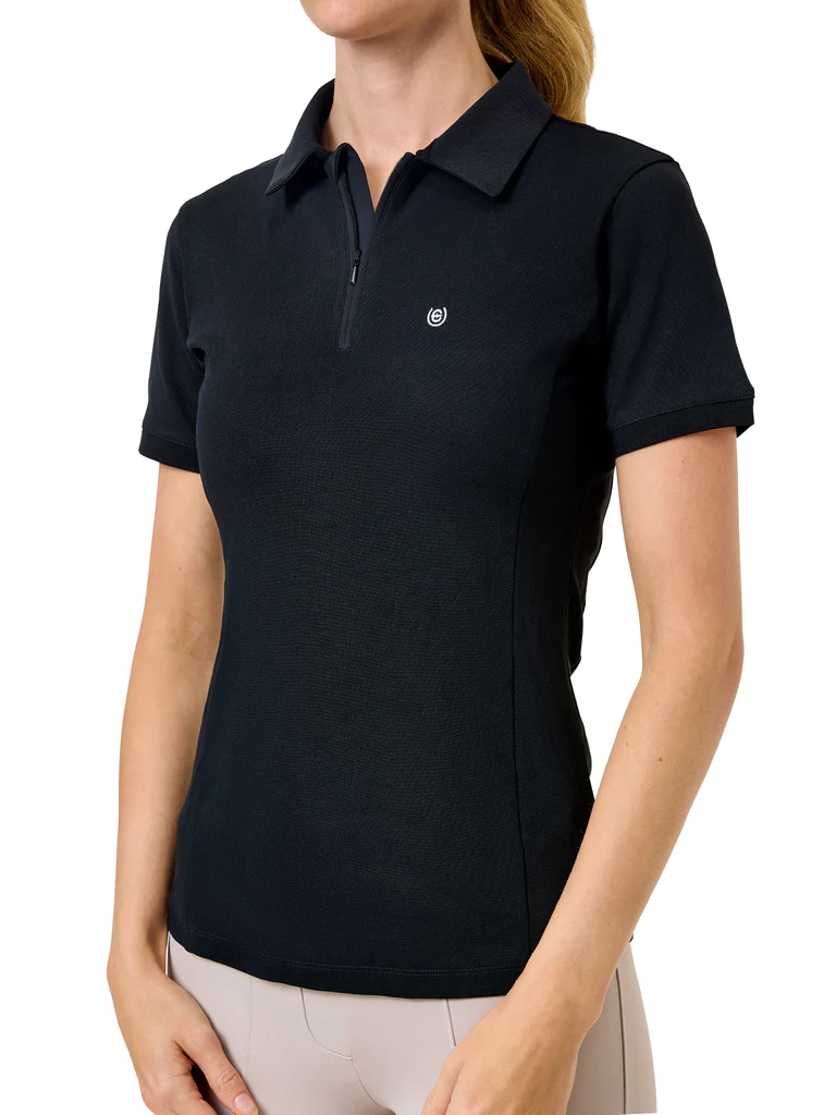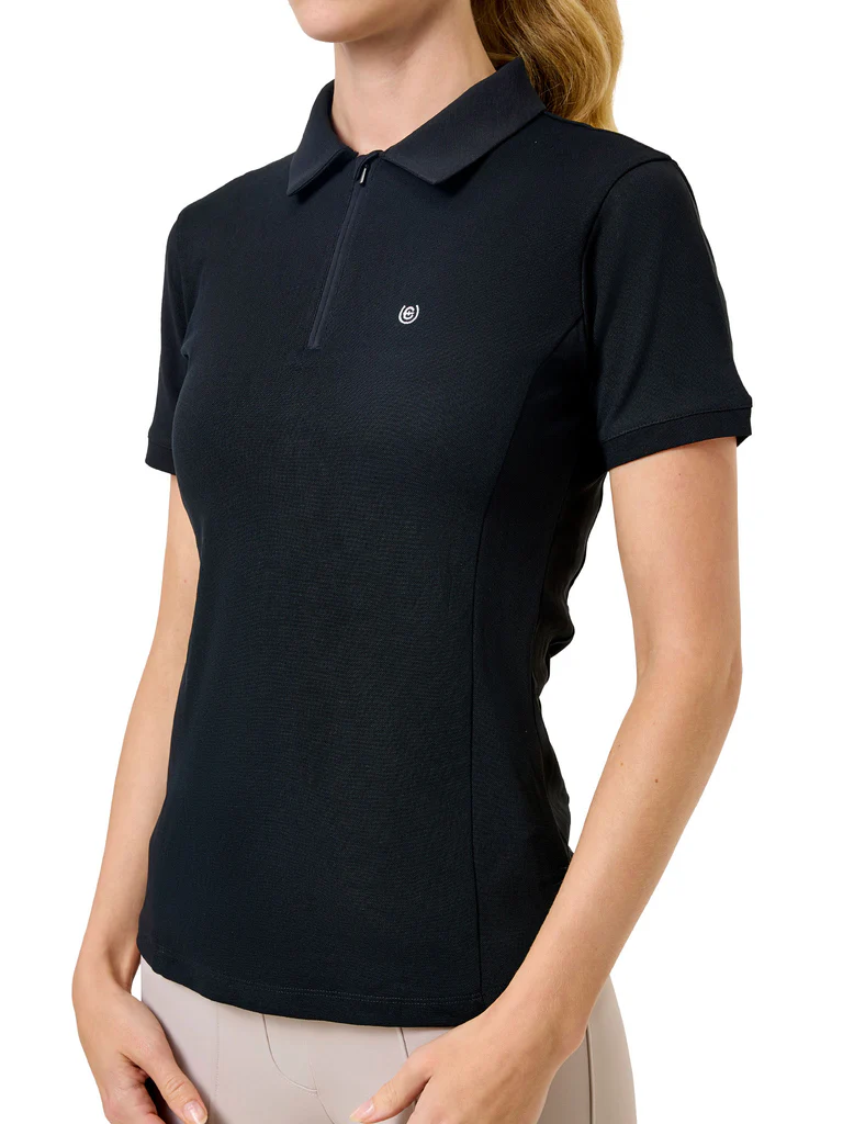 Czarna koszulka polo z zamkiem błyskawicznym z przodu, idealna na treningi w ciepłe dni. Chłodząca, oddychająca dzianina i smukły, elegancki krój sprawiają, że jest to uniwersalny element garderoby dla amazonek.