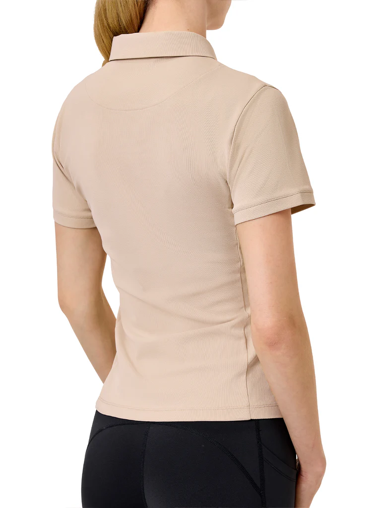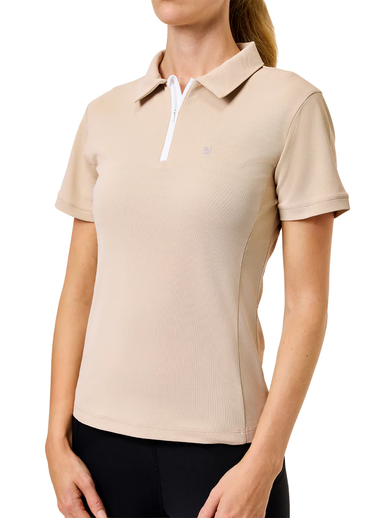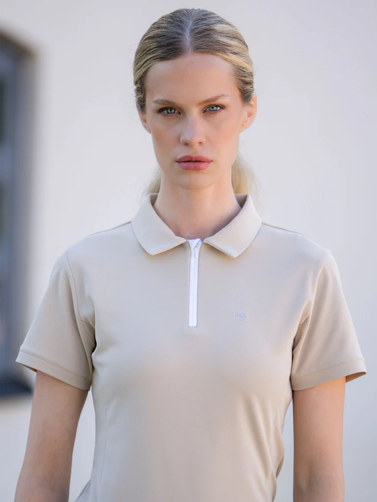 Czarna koszulka polo z zamkiem błyskawicznym z przodu, idealna na treningi w ciepłe dni. Chłodząca, oddychająca dzianina i smukły, elegancki krój sprawiają, że jest to uniwersalny element garderoby dla amazonek.