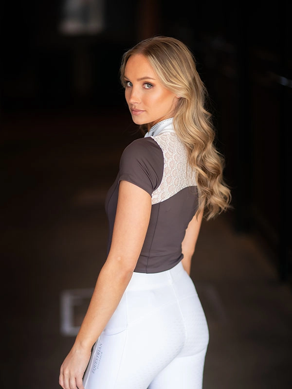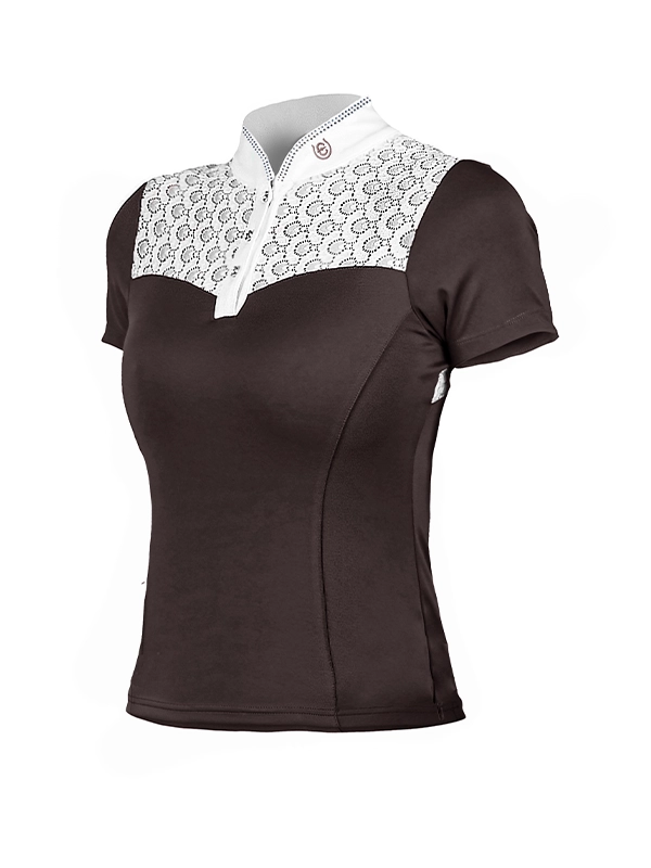 Koszulka konkursowa Crystal Champion w pięknym brązowo-fioletowym kolorze z białymi koronkowymi detalami z przodu i z tyłu.