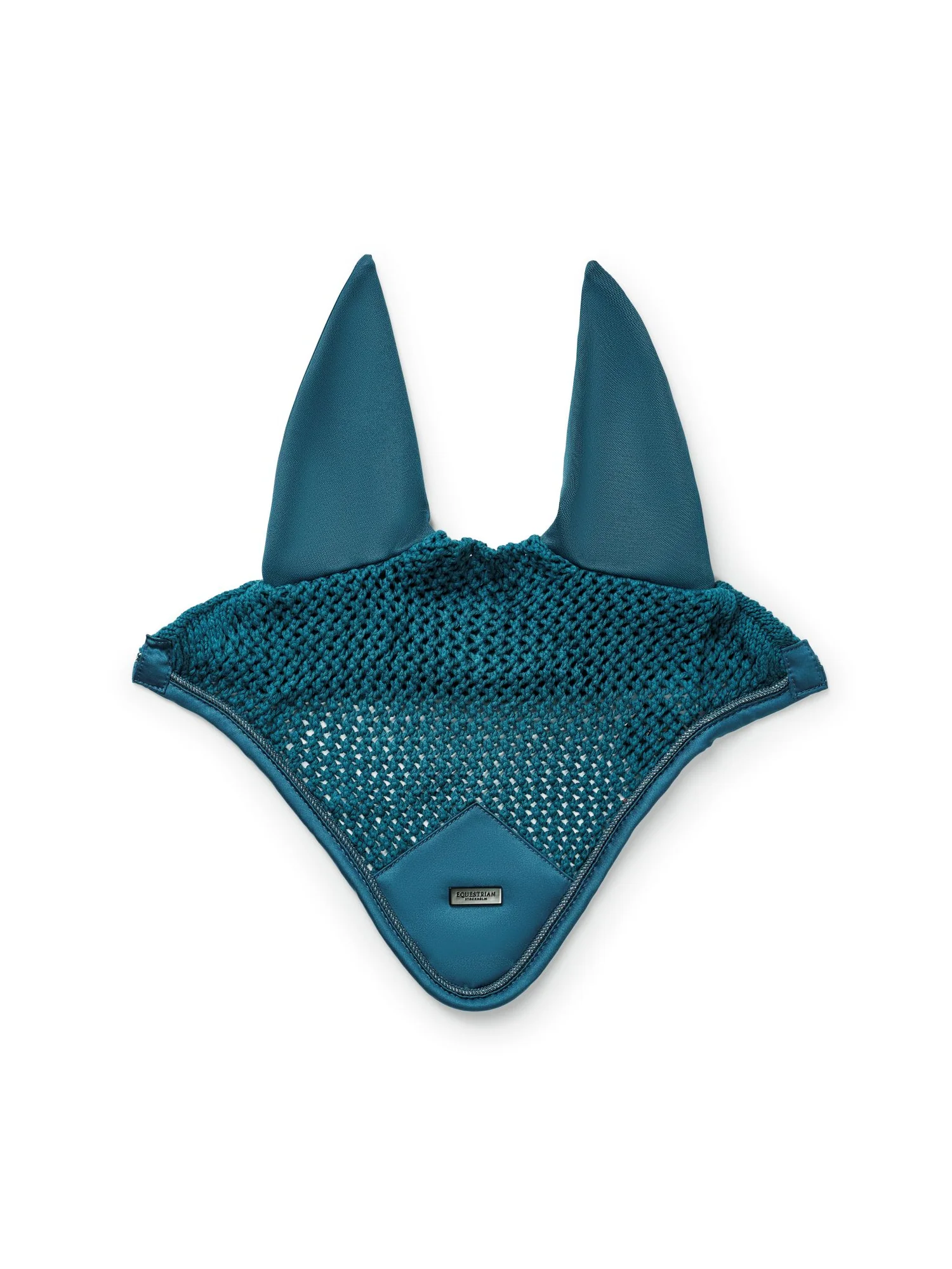Luksusowe nauszniki w kolorze morskim ze stylowymi detalami w kolorze srebrnym.