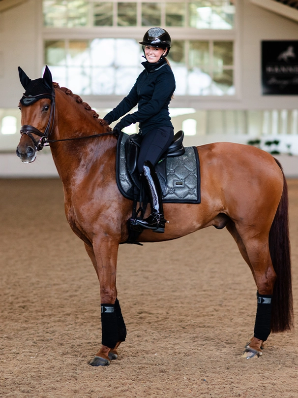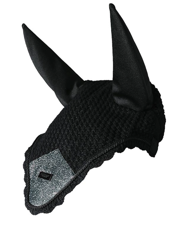 Luksusowe nauszniki w kolorze czarnym ze stylowymi detalami w kolorze szaro-zielonym połączonym z brokatem. Nauszniki maja czarną lamówkę i chromowaną plakietkę z napisem Equestrian Stockholm.