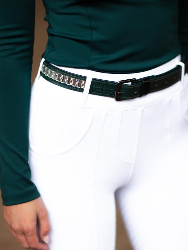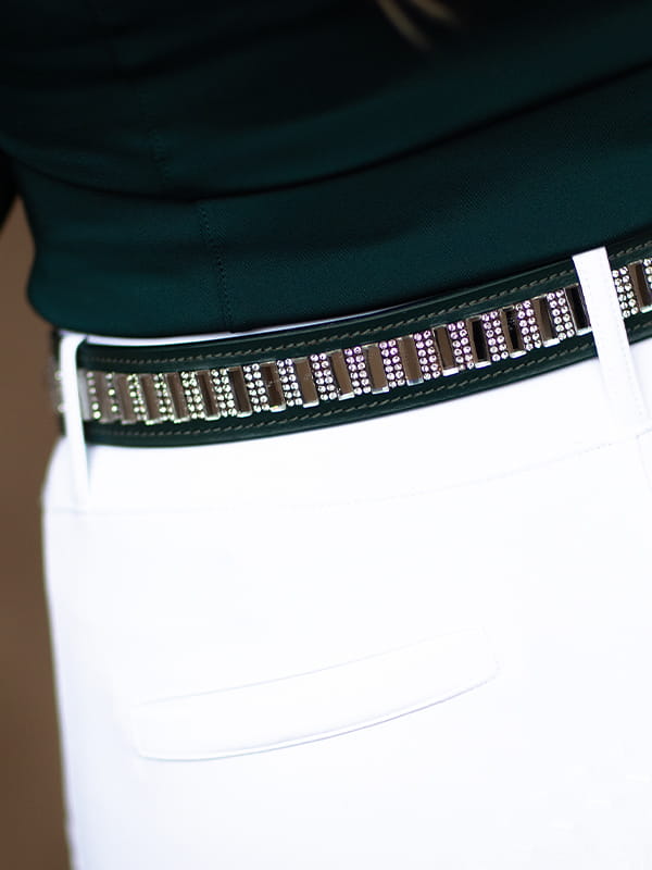 Kryształy umieszczone na pasku są przezroczyste. Klamra jest w kolorze czarnym.