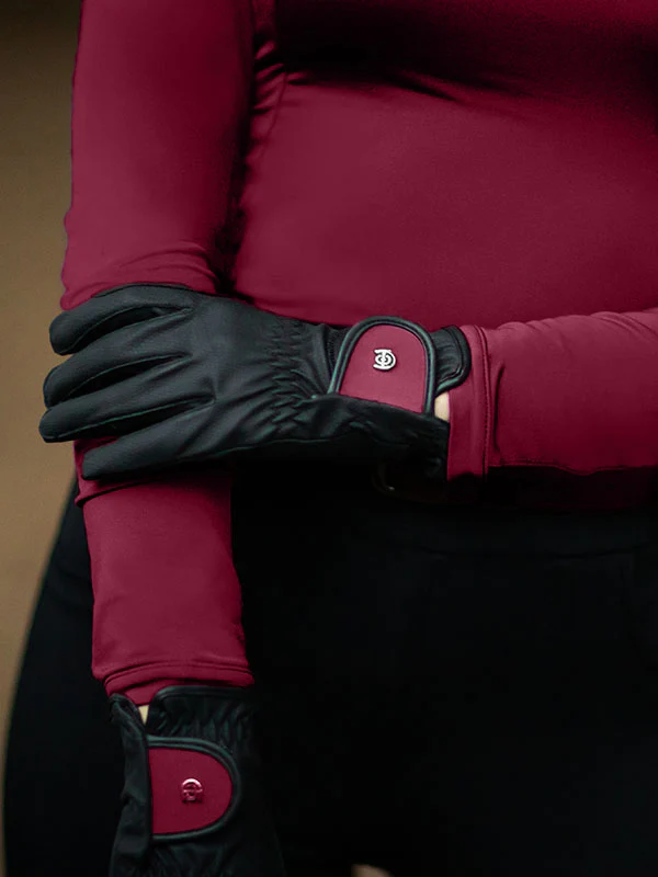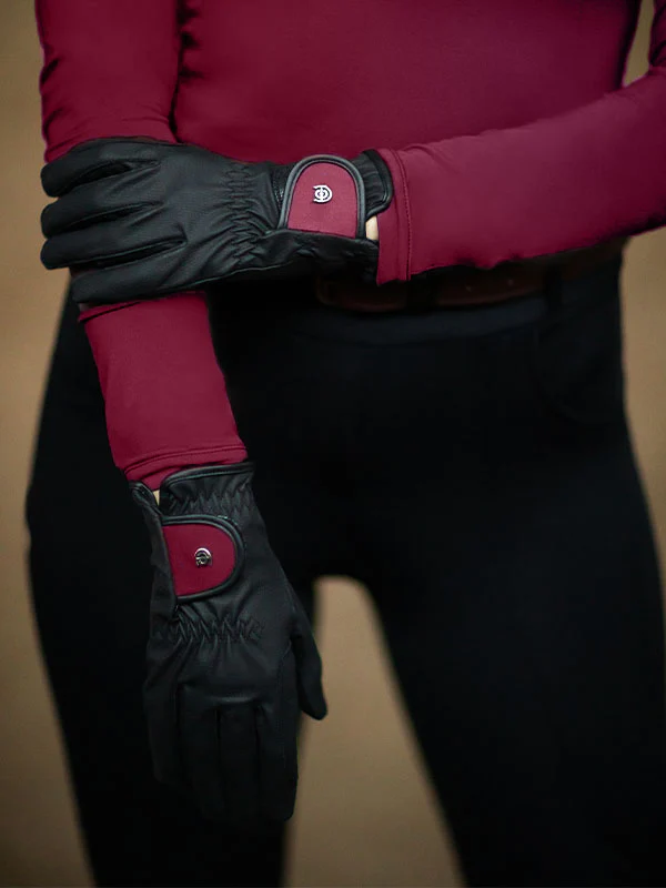 Rękawiczki posiadają na palcu wskazującym i kciuku materiał z funkcją dotykową. Ozdobione są czarną satyną oraz małą naszywką Equestrian Stockholm w kolorze bordowym.